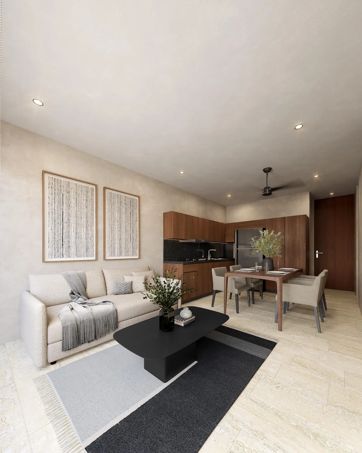 Los departamentos cuentan con acabados de lujo, incluyendo pisos de mármol travertino, mesetas de granito en la cocina y mármol en los baños, carpintería de alta calidad y preparación para aire acondicionado.AMÉ 34 ofrece una oportunidad única para vivir en una de las zonas más valoradas de Mérida, con un diseño que prioriza el bienestar y la calidad de vida.